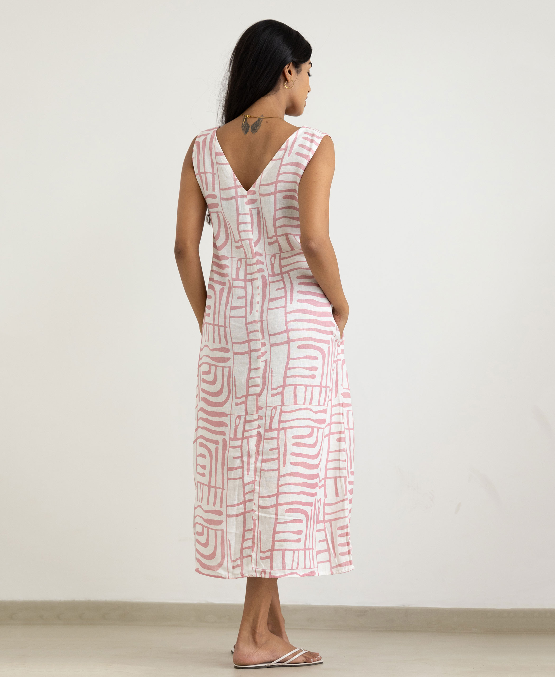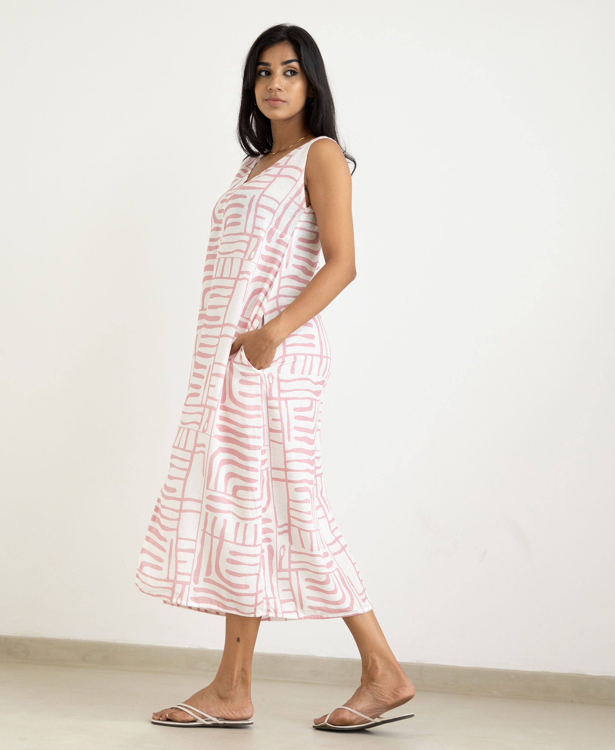 Product name – Nuri dress Neckline- v neck Silhouette- Relaxed Length- Midi Sleeve Length – Sleeveless Fabric – Linen Model wears – UK08