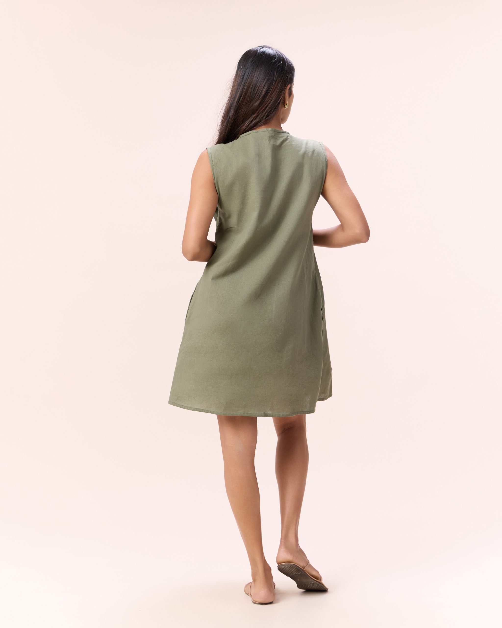 Product name – Zeya Dress Olive Neckline- Round neck Silhouette- Relaxed Length- Mini Sleeve Length – Sleeveless Fabric – Linen Model wears – UK08